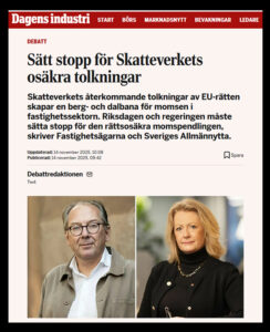 ”Skatteverkets återkommande tolkningar av EU-rätten skapar en berg- och dalbana för momsen i fastighetssektorn. Riksdagen och regeringen måste sätta stopp för den rättsosäkra momspendlingen. Förändringen berör enligt uppskattningar cirka en miljon hushåll och riskerar att leda till en merkostnad på 100-tals miljoner kronor för hyresgästerna”, framhåller Fastighetsägarna och Sveriges Allmännytta i debattartikeln.
