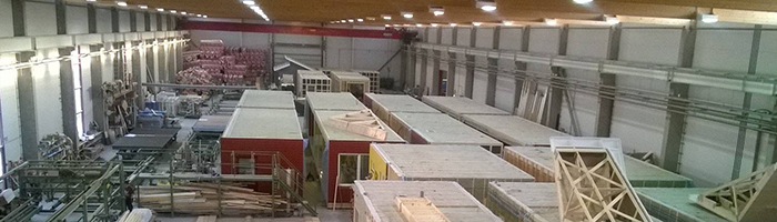 Färdiga moduler i trä byggda inomhus i fabrik.
