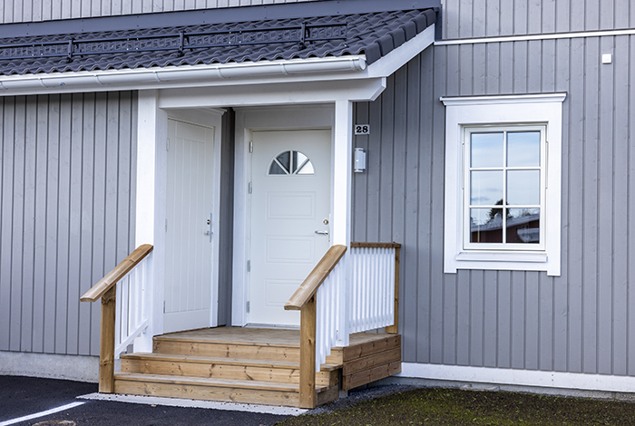 Träfasad med liggande eller stående panel 23×145 UYV standard i valfri färg. Ribbläkt valbar. Putsfasad möjlig till merkostnad.