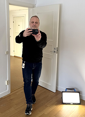 – Under vinterhalvåret, när är det mörkt i lägenheten, har jag med en bygglampa som lyser upp lägenheten, berättar han.