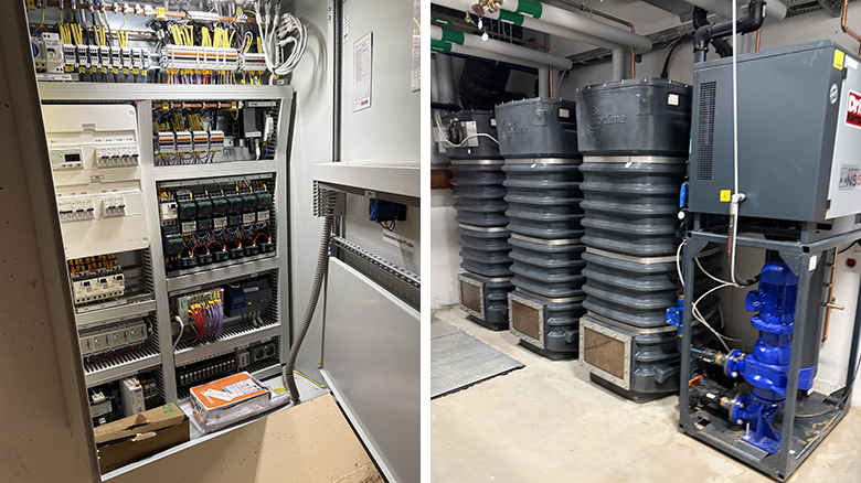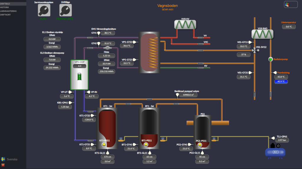 En av de viktigaste komponenterna i lösningen är det integrerade styrsystemet. Det övervakar temperaturer, nivåer och flöden, och optimerar kontinuerligt hur energin används. I första hand prioriteras uppvärmning av inkommande kallvatten, som höjs från cirka 7 grader till omkring 35 grader med värmepumpen. Därefter spetsas varmvattnet till 55 grader med fjärrvärme. När varmvattenbehovet är lågt producerar systemet i stället värme.